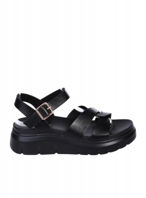 Sandale de damă din piele ecologică. Culoarea oferită - negru. Partea interioară este din piele ecologică. Înălţimea tocului - cm. Platforma din faţă este de cm.