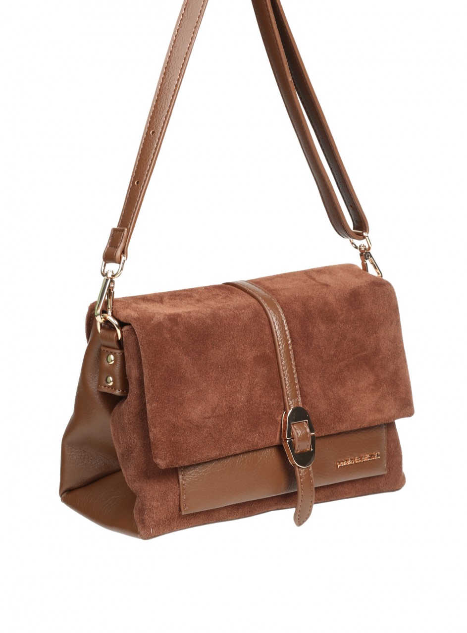 Geantă de damă confecționată din material textil și piele ecologică, cu mâner lung atașat. Disponibilă în culoarea camel. Geanta are trei compartimente, două buzunare interioare și unul exterior.