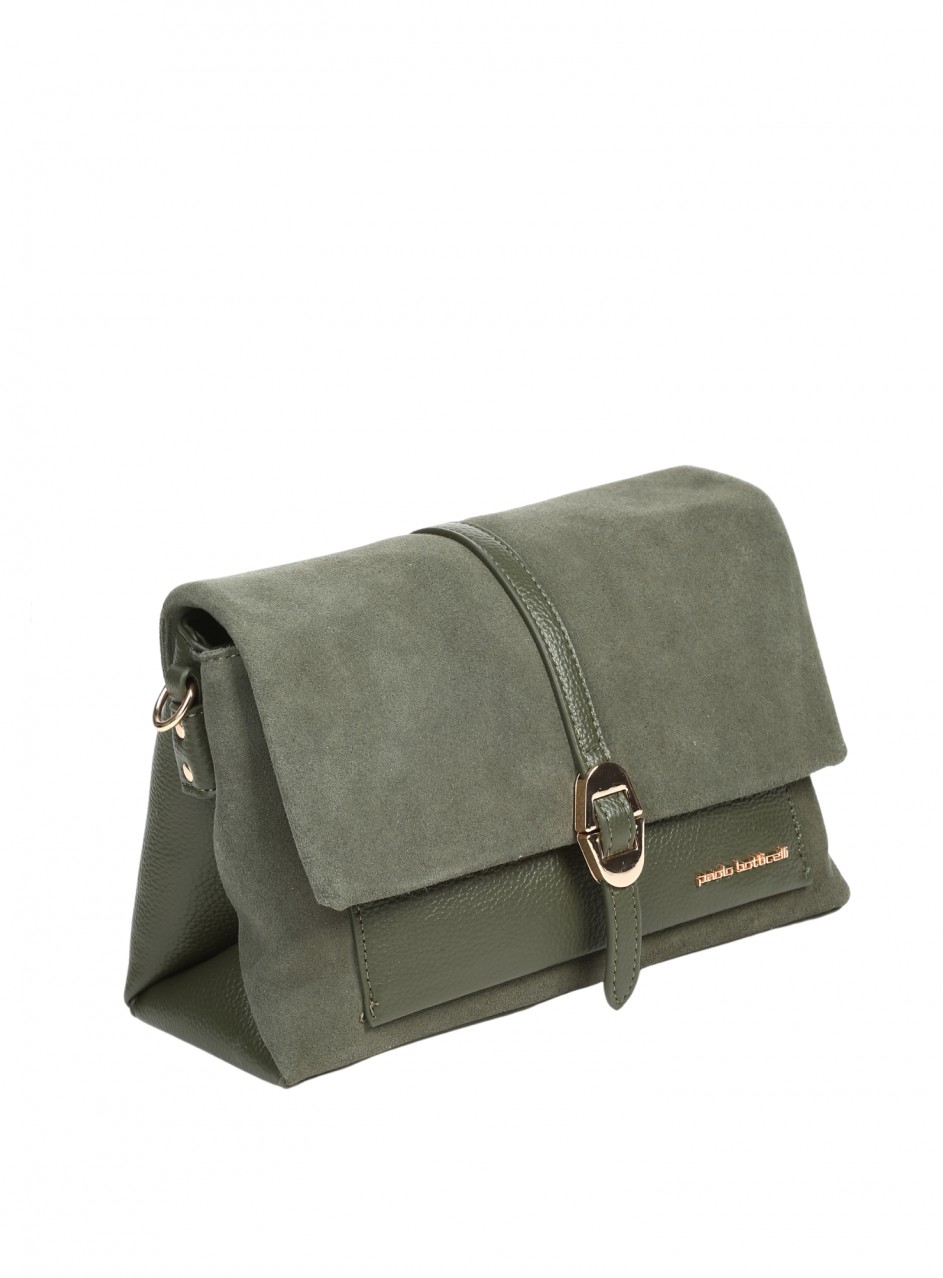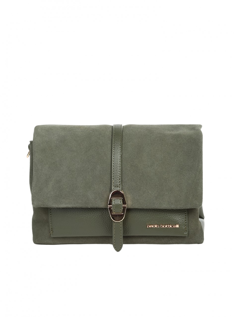 Geantă de damă confecționată din material textil și piele ecologică, cu mâner lung atașat. Disponibilă în culoarea verde. Geanta are trei compartimente, două buzunare interioare și unul exterior.