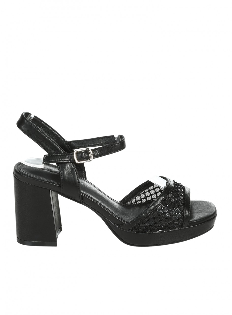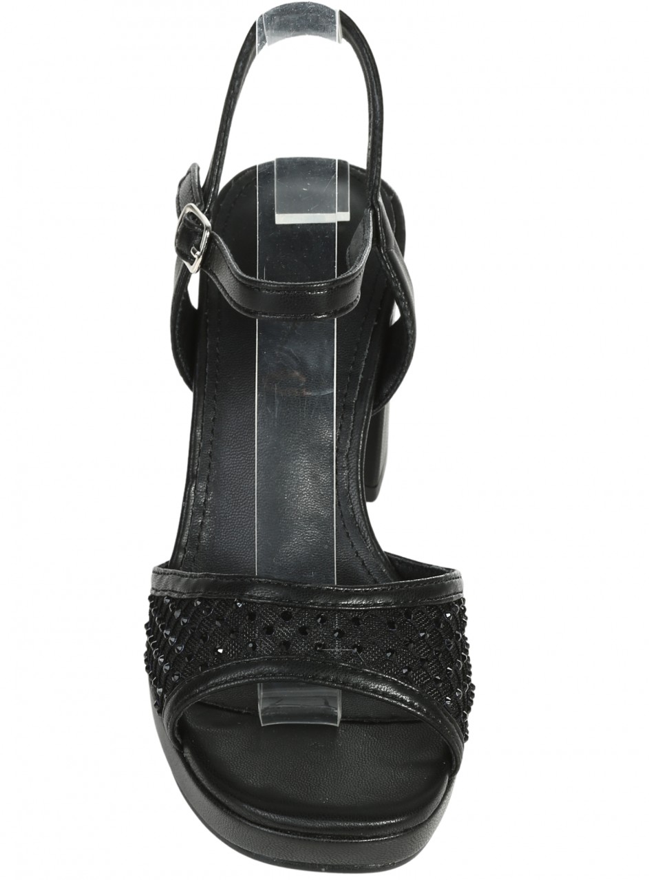 Sandale casual cu platformă pentru femei, confecționate din piele ecologică, material textil și pietre decorative. Disponibile în culoarea neagră. Partea interioară este confecționată din piele ecologică.