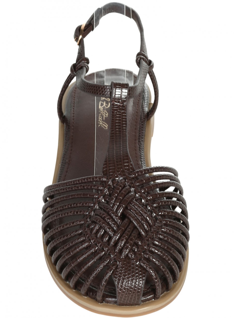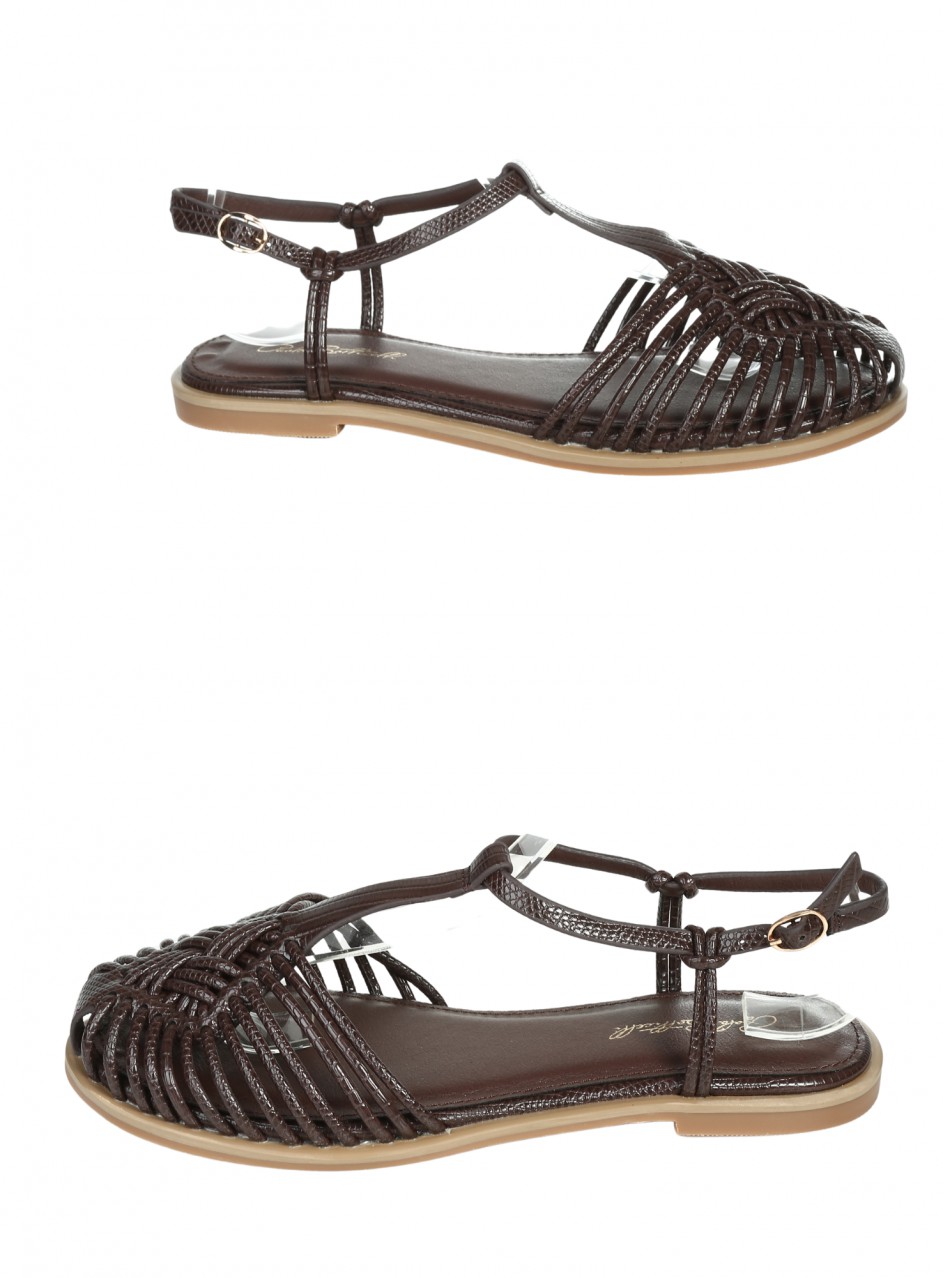 Sandale plate casual pentru femei, confecționate din piele ecologică. Disponibile în culoarea maro. Partea interioară este confecționată din piele ecologică.