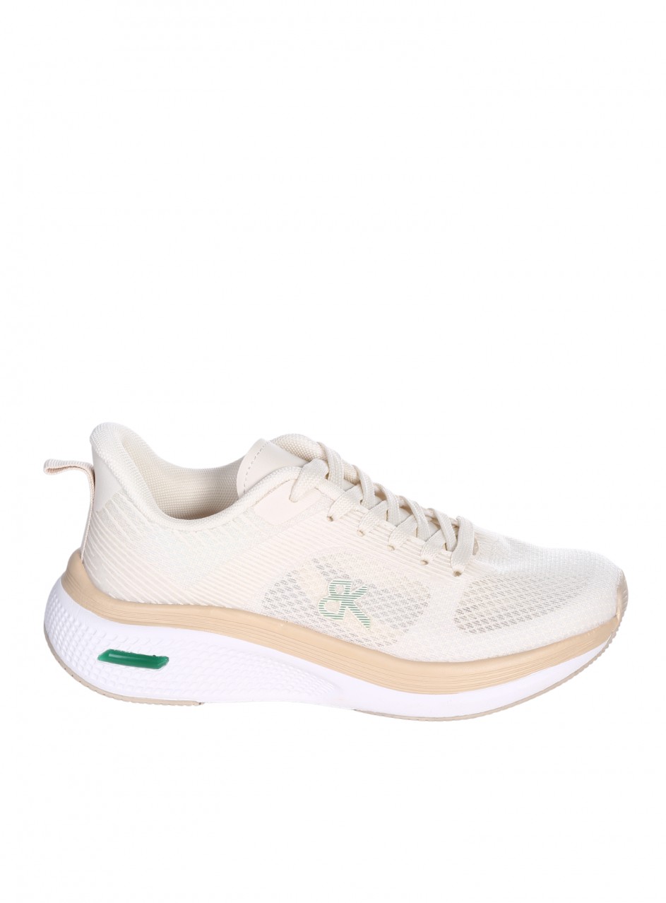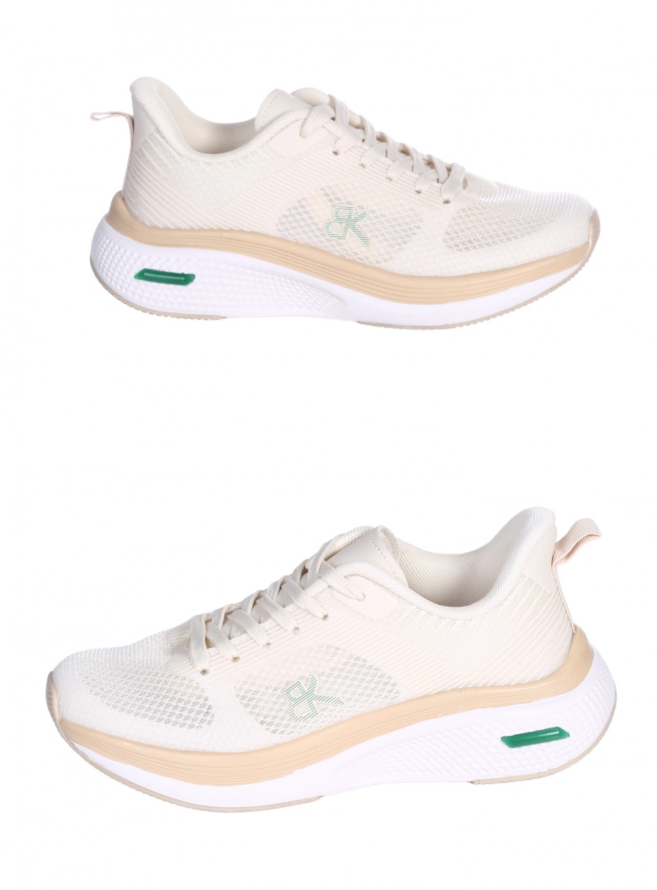 Pantofi casual de damă confecționați din piele ecologică și material textil. Disponibili în culoarea bej. Partea interioară este confecționată din material textil.