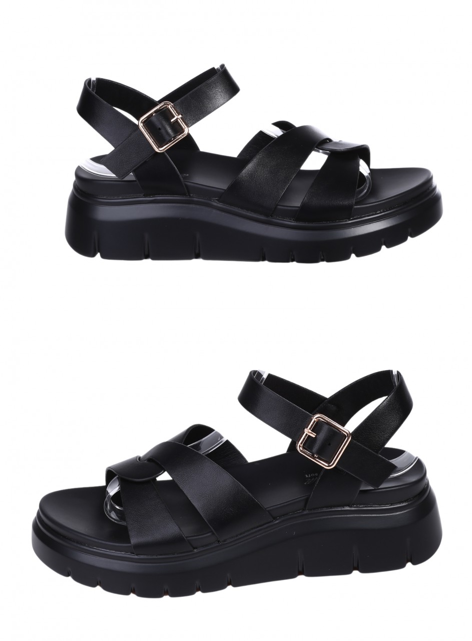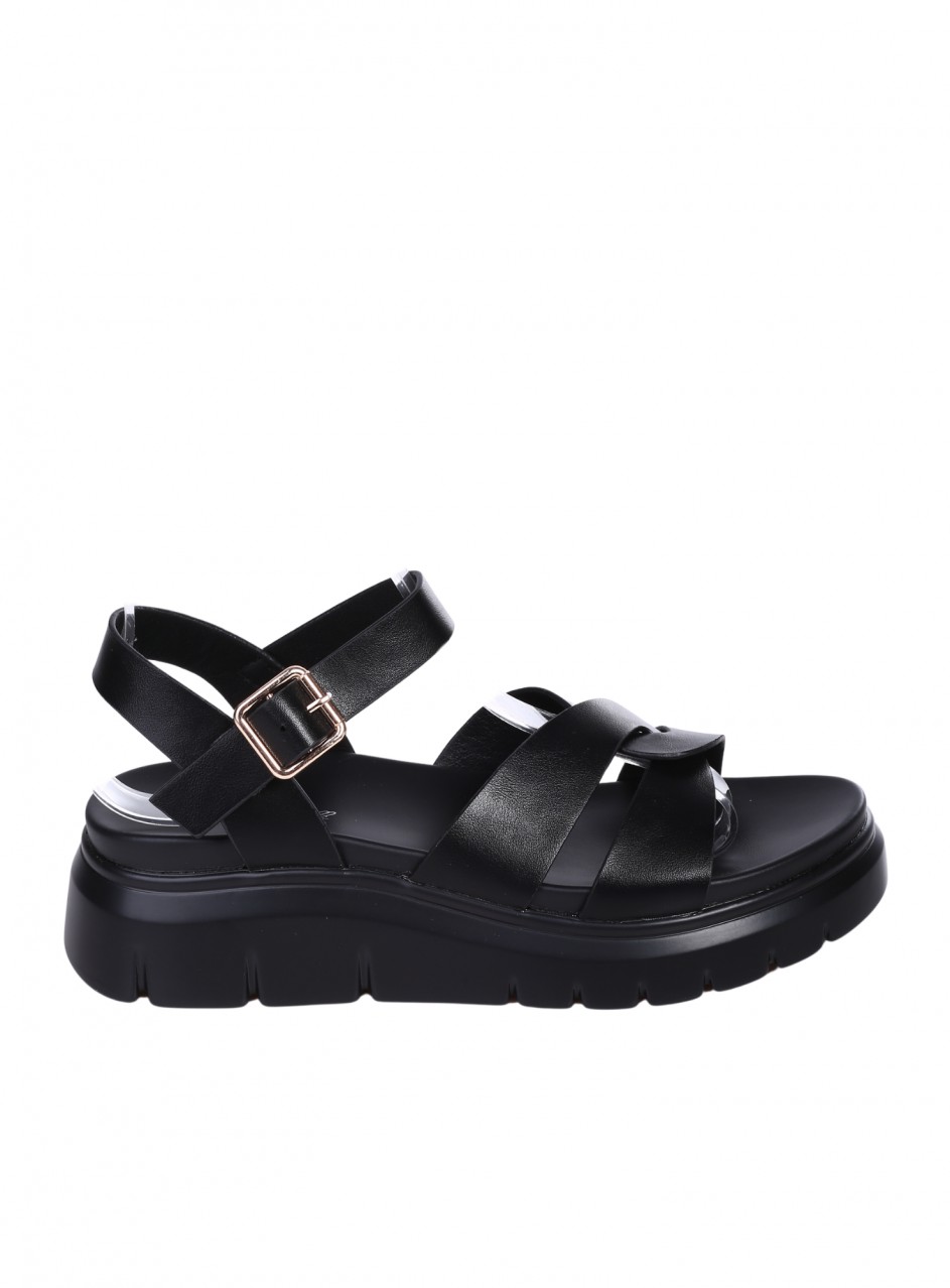 Sandale casual pentru femei, confecționate din piele ecologică. Disponibile pe negru. Partea interioară este confecționată din piele ecologică, cu o talpă confortabilă.
