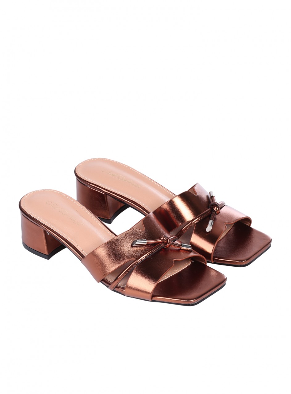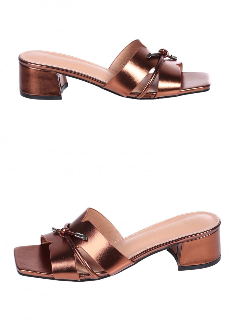 Papuci de damă casual cu toc, confecționați din piele ecologică. Disponibili în culoarea bronzului. Partea interioară este confecționată din piele ecologică. Înălțimea tocului este de 5 cm.