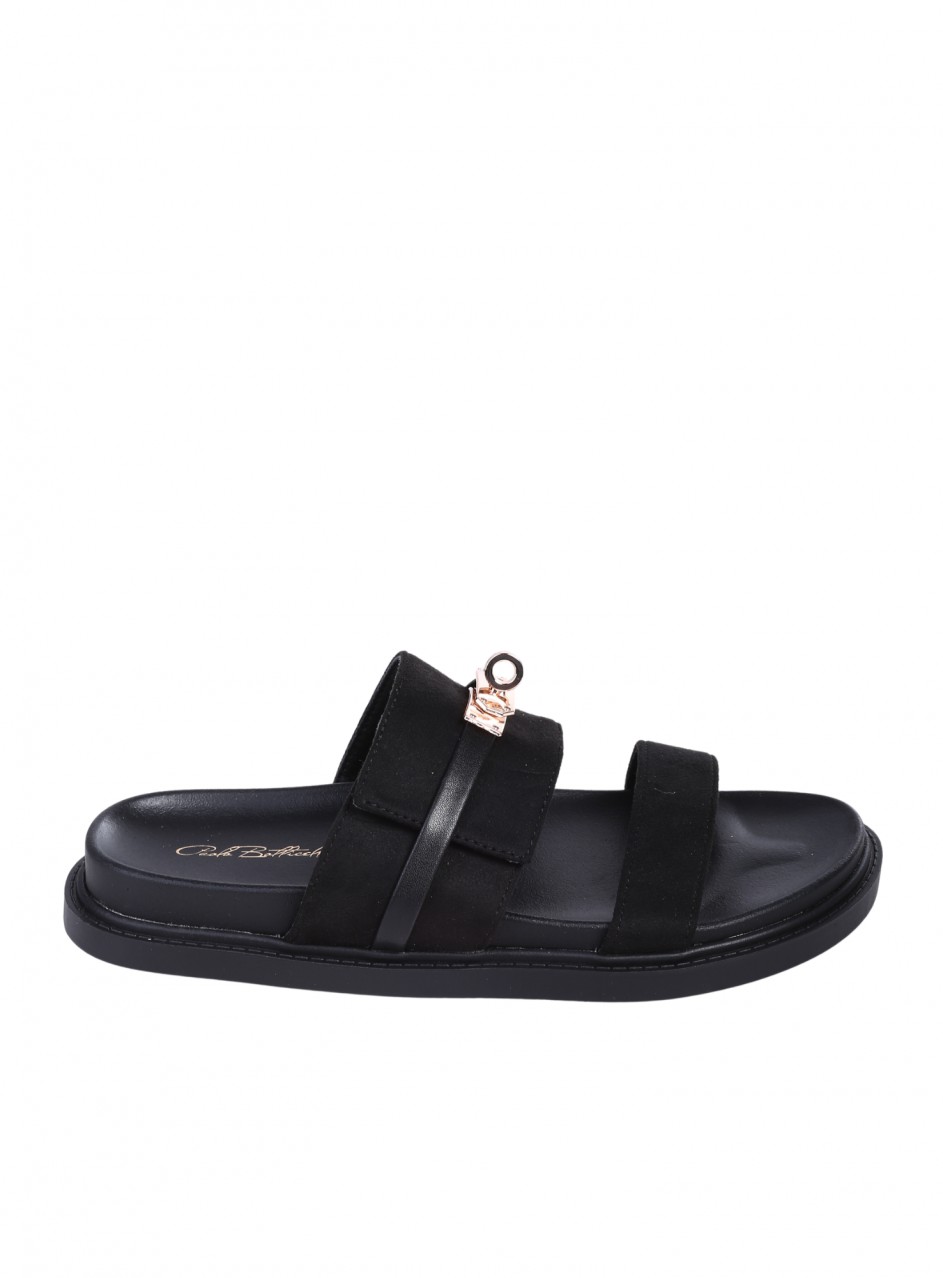 Papuci de damă casual, confecționați din piele ecologică și material textil. Disponibili în culoarea neagră, cu ornament metalic decorativ. Partea interioară este confecționată din piele ecologică.