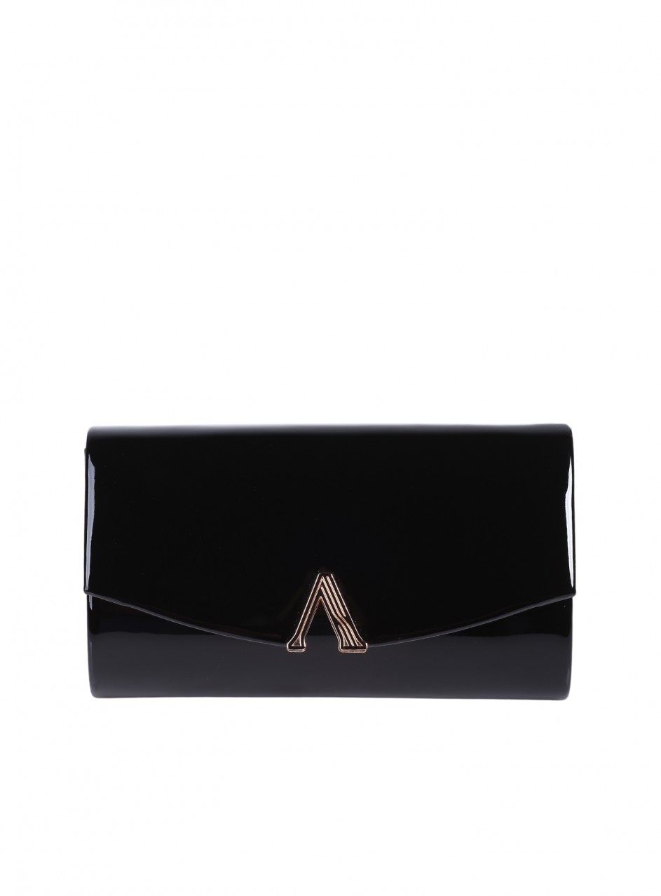 Geantă de damă confecționată din lac și material textil, cu mâner lung detașabil. Disponibilă în culoarea neagră, cu ornament metalic decorativ. Geanta are un compartiment și un buzunar interior.