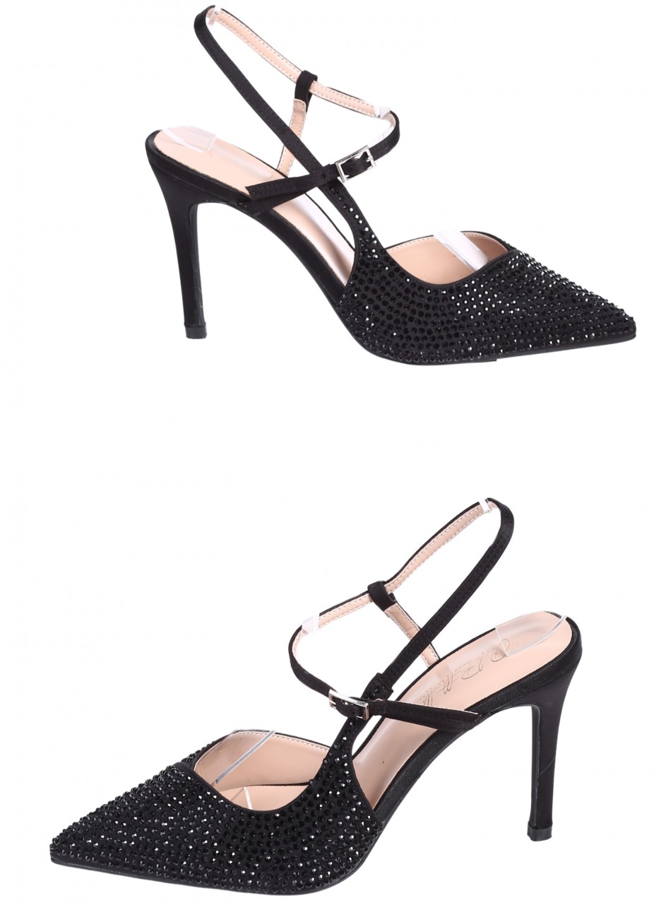 Pantofi eleganți de damă cu toc înalt, confecționați din material textil. Disponibili în culoarea neagră, cu pietre decorative. Partea interioară este confecționată din piele ecologică.