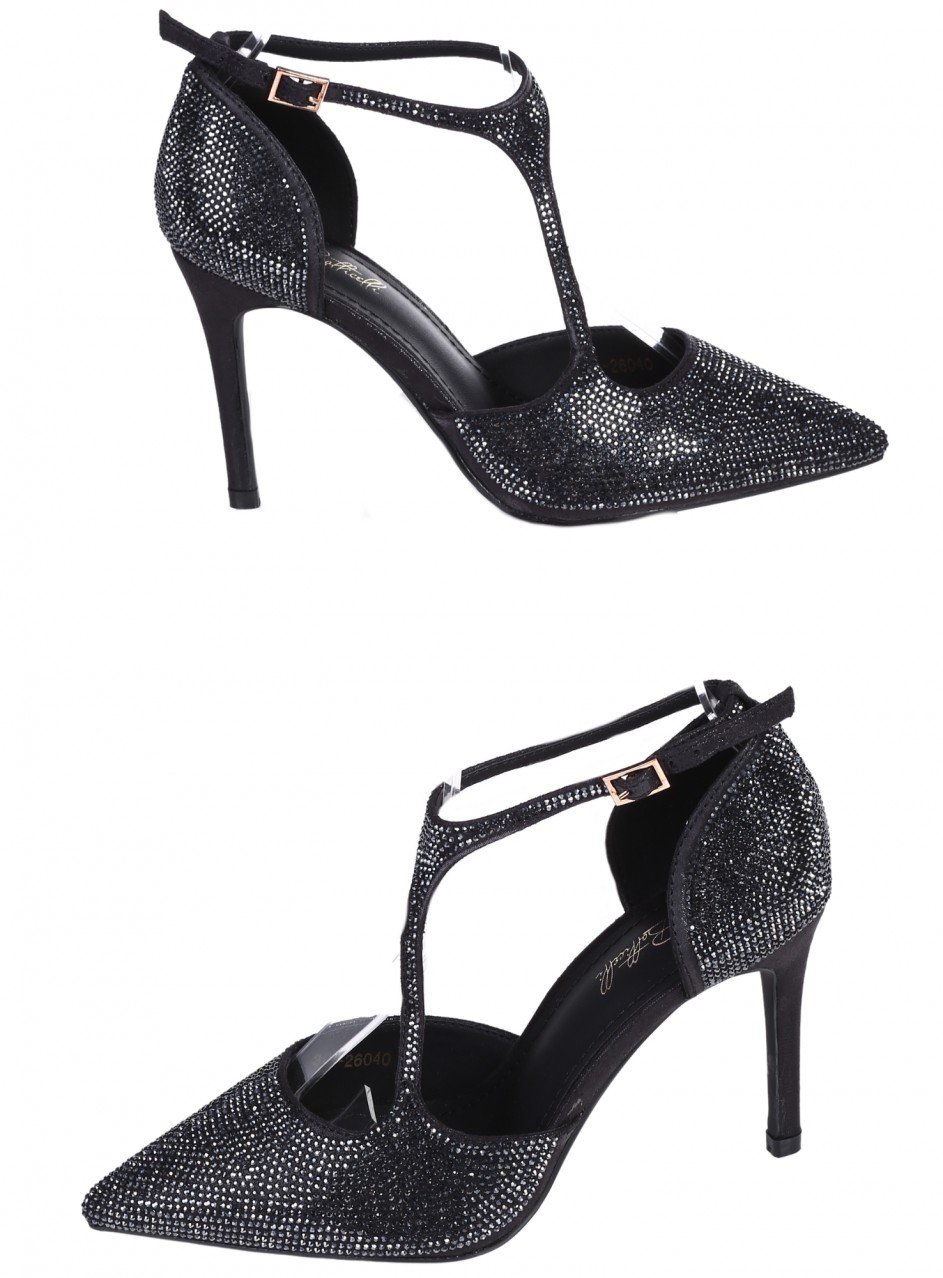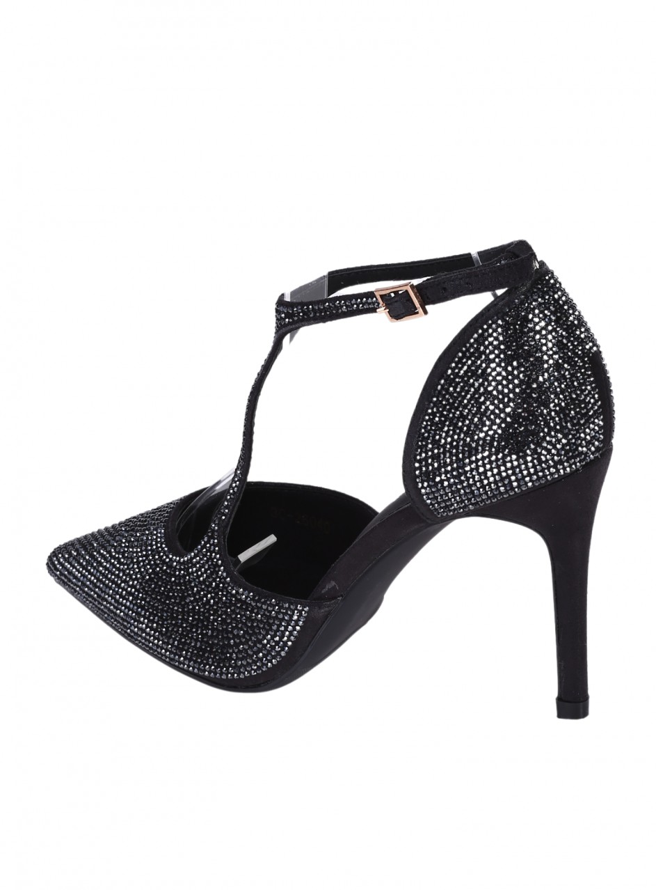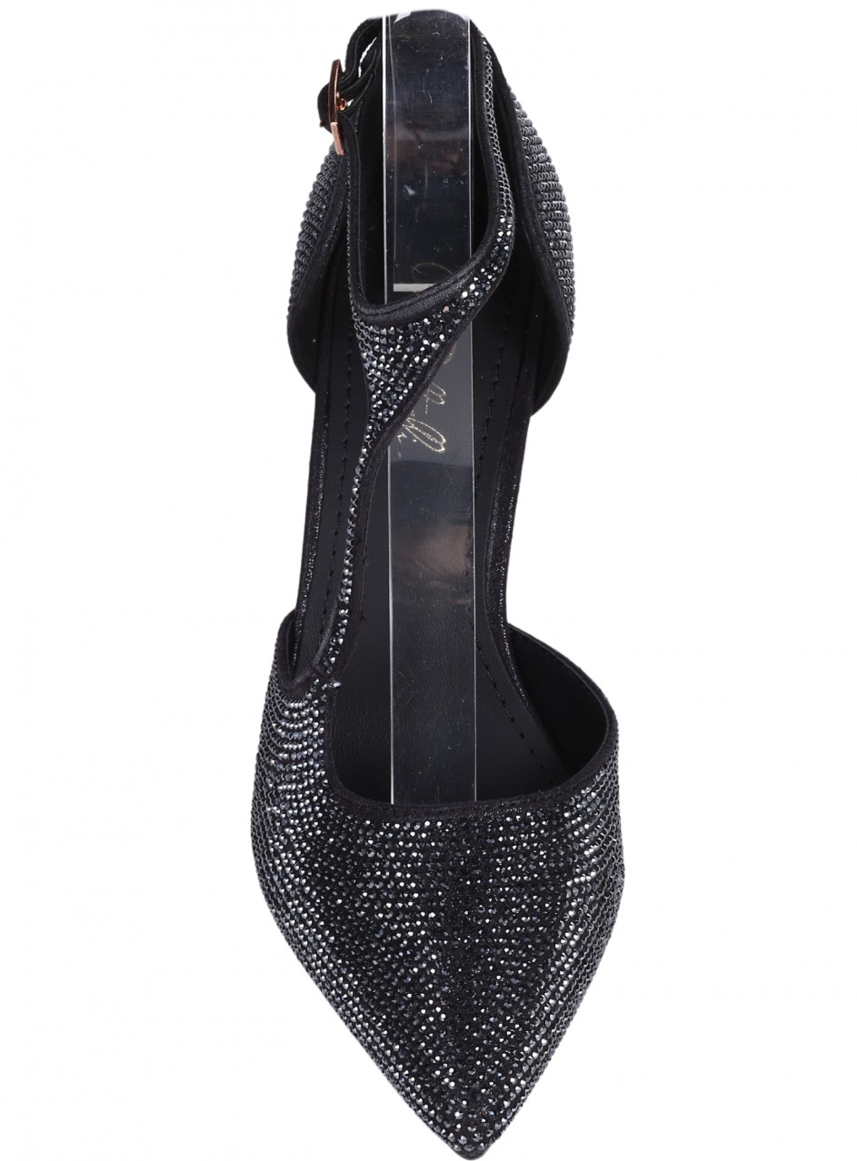 Pantofi eleganți de damă cu toc înalt, confecționați din material textil. Disponibili în culoarea neagră, cu pietre decorative. Partea interioară este confecționată din piele ecologică. Înălțimea tocului este de 9 cm.