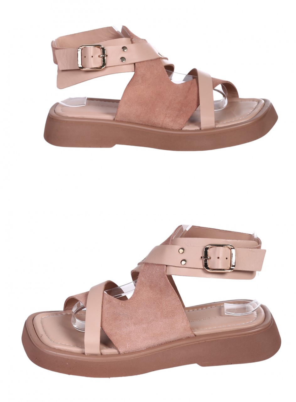 Sandale de damă de zi cu zi, confecționate din piele întoarsă naturală. Disponibile în culoarea bej, cu barete reglabile. Partea interioară este confecționată din piele naturală.